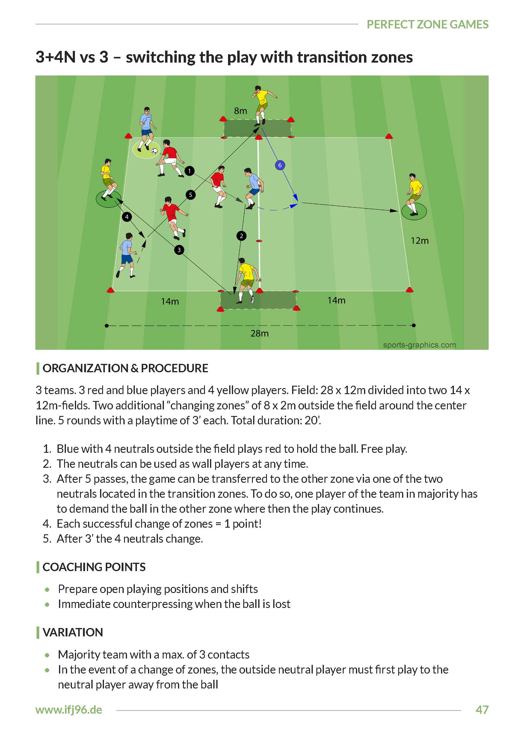 Zone games train all four phases of football (own possession, transition after losing the ball, opponent’s possession, and transition after winning the ball). They develop not only game intelligence and possession play, but also the behavior in overload, equal, and underload situations. In addition, they promote transition play, switches of play, counter-pressing after losing the ball, and optimal occupation of space after regaining possession.