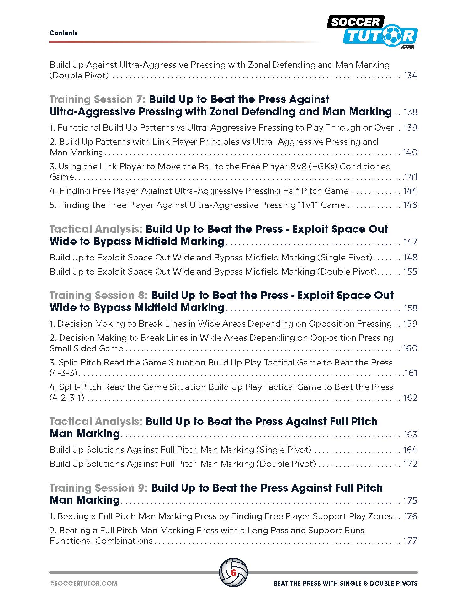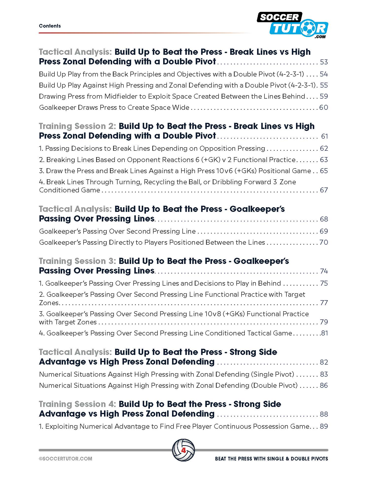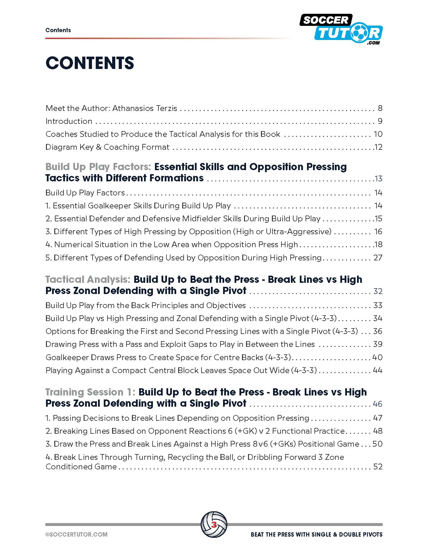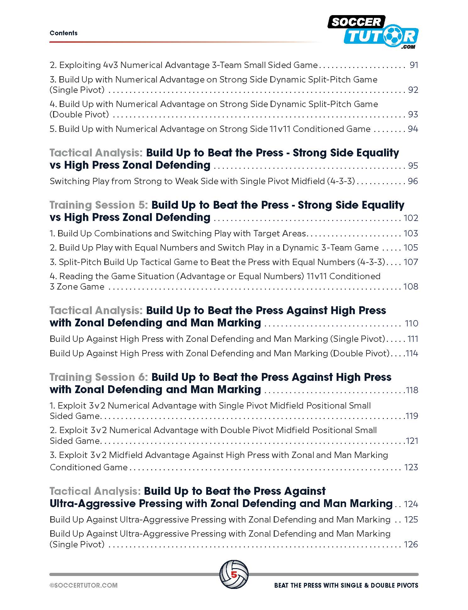 Discover how top coaches beat the press using single and double pivots (4-3-3 and 4-2-3-1). This book breaks down their 80+ tactics in detail and gives you 53 practices, 9 ready-to-use training sessions to coach these build-up strategies with your team.