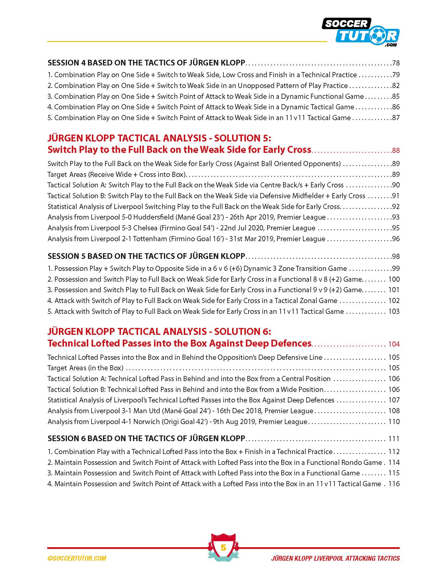 Each Tactical Situation has analysis of Jürgen Klopp Liverpool attacking tactics and is followed by a full training session to help you input the tactics into your training sessions for your team.