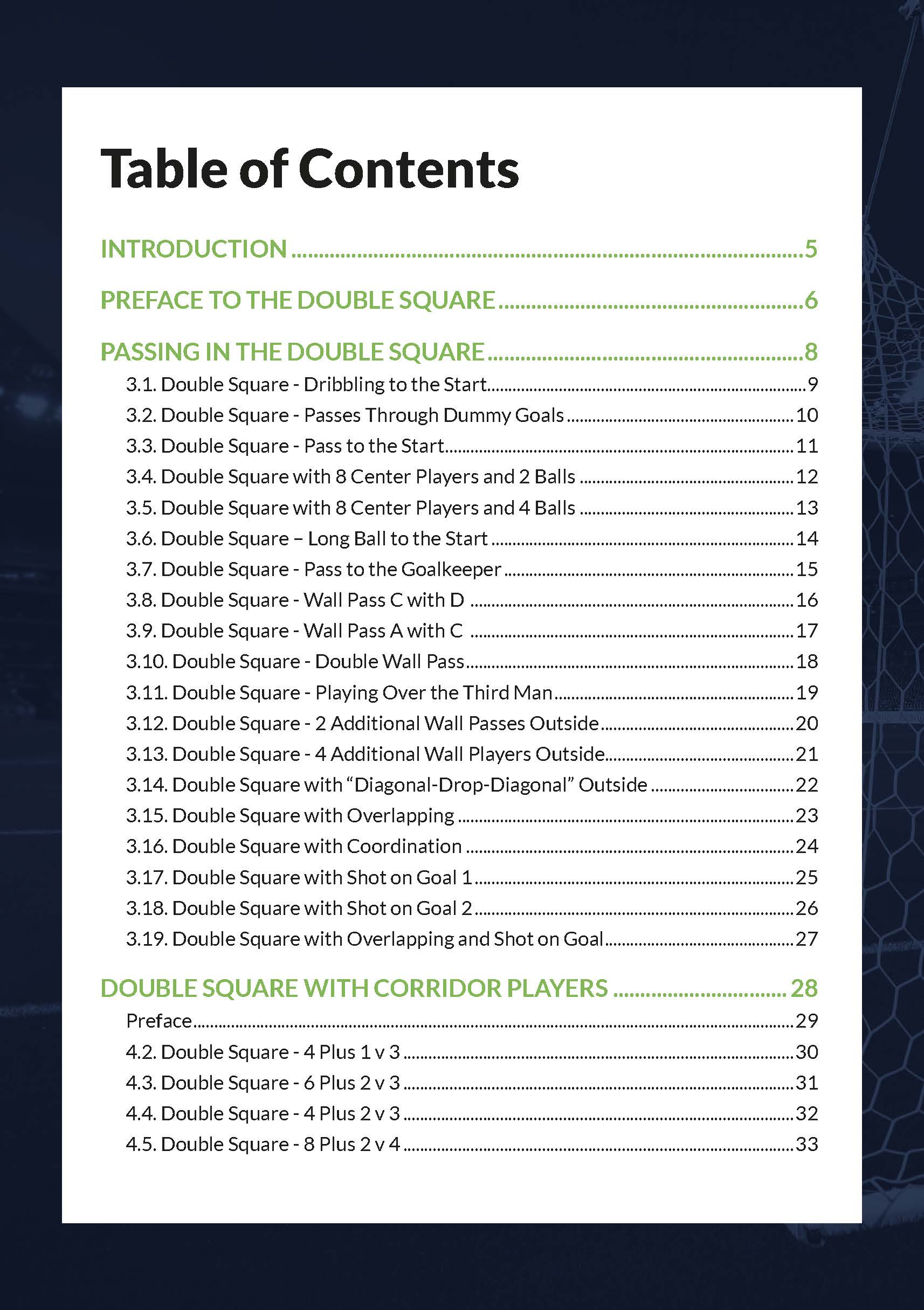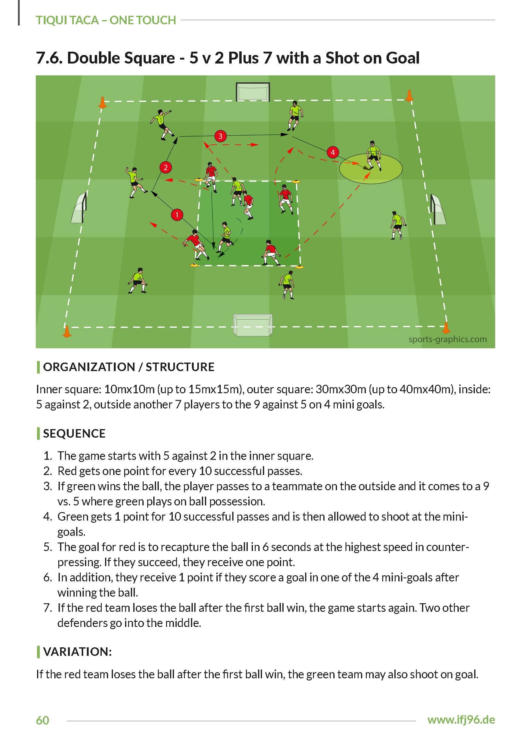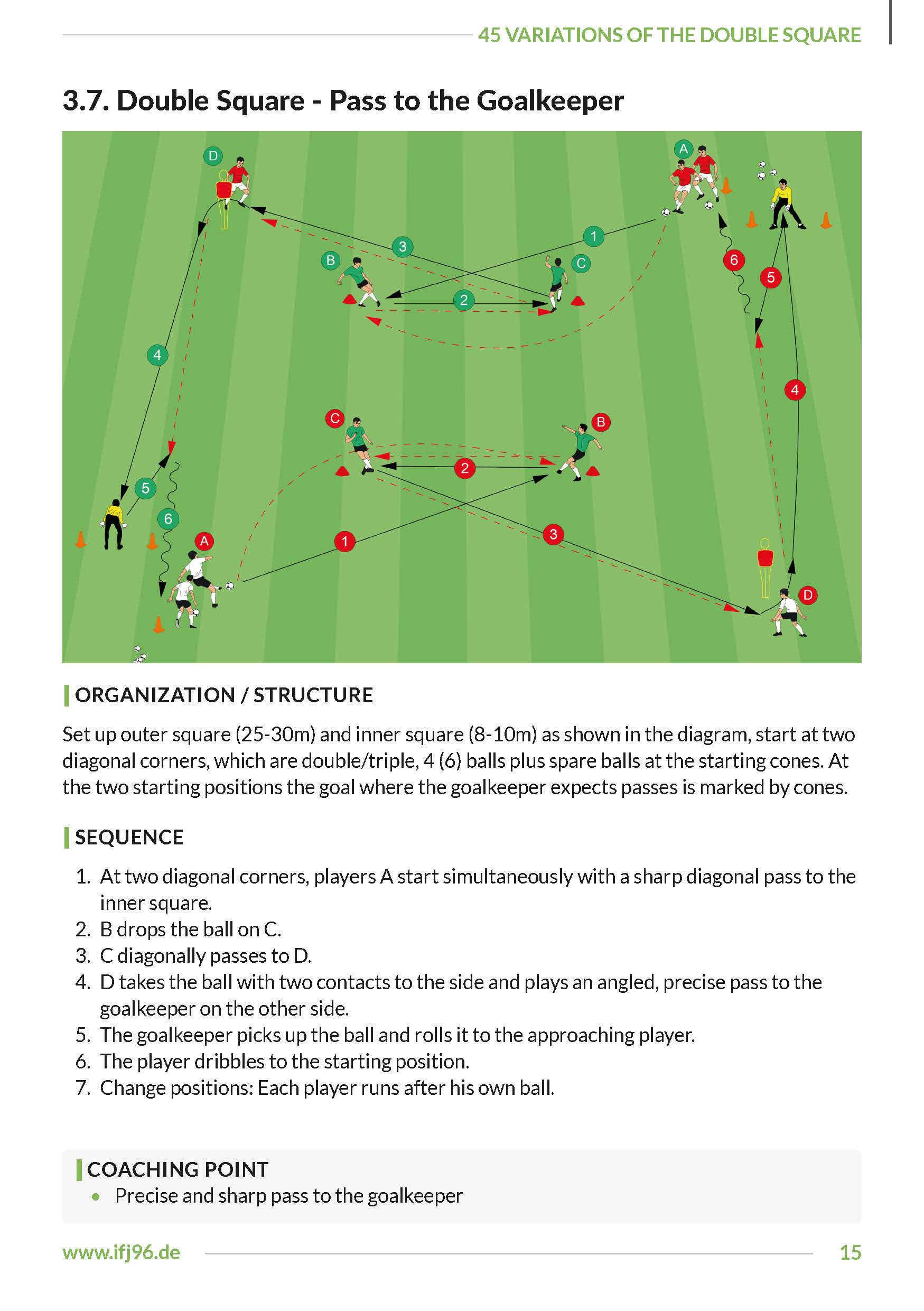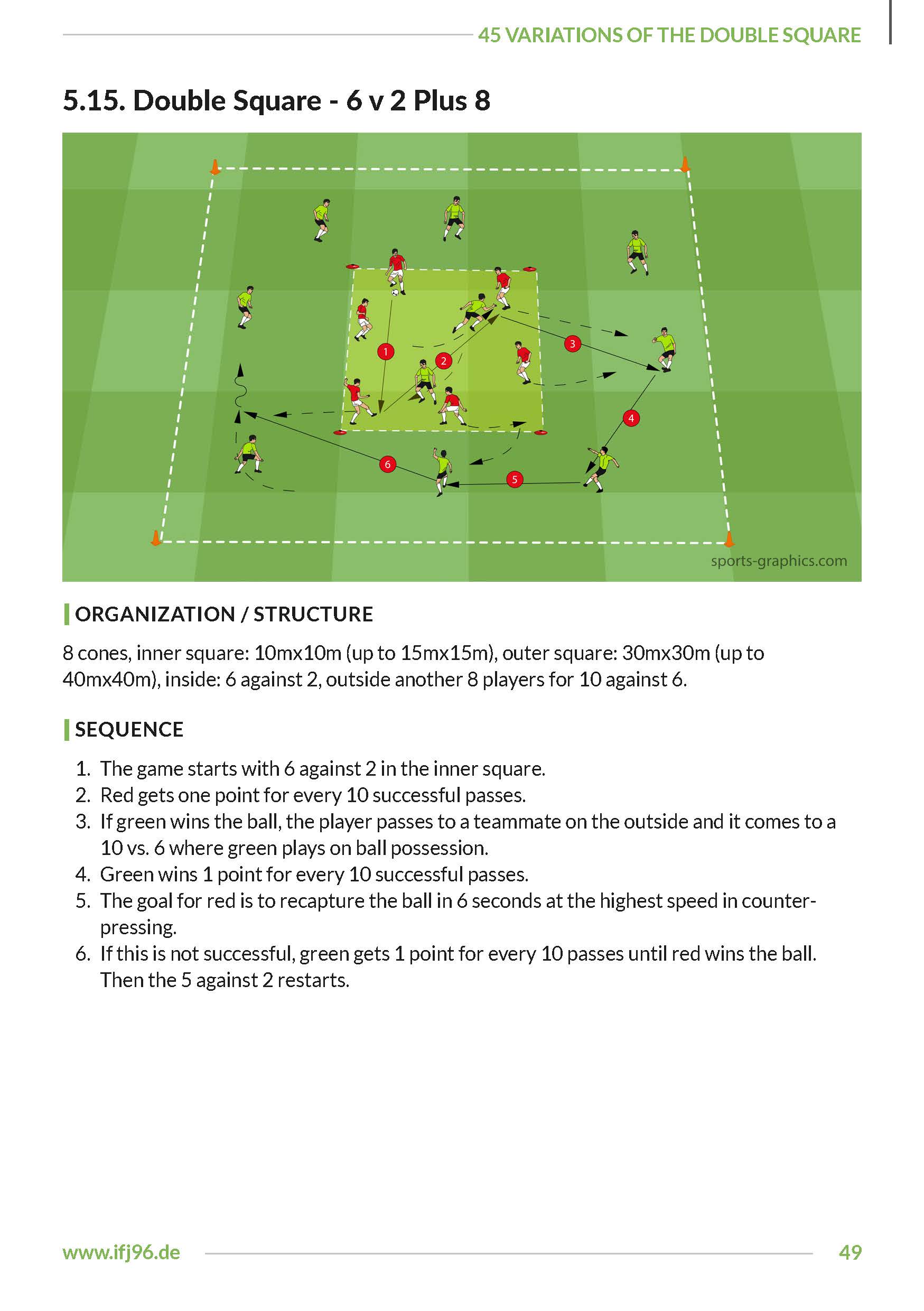 45 great Variations of the Double Square. Improve the passing and combination play of your players! Game Forms with Pressing, Counter Pressing and Shot on Goal!